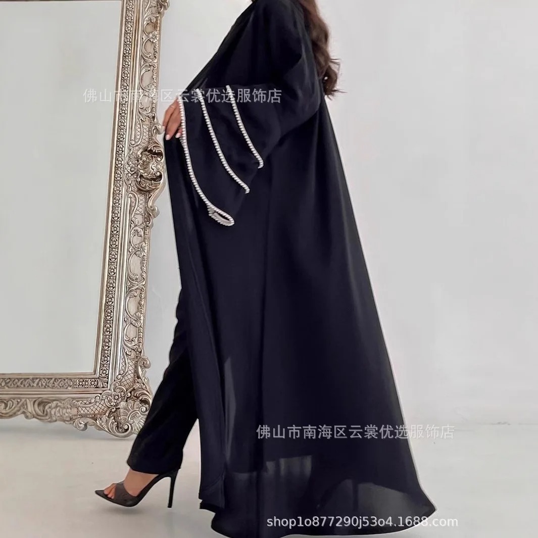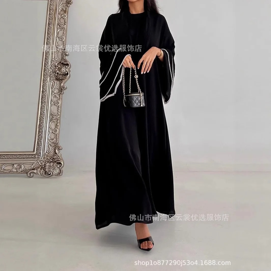"عباية سوداء طويلة الأكمام، تصميم مستوحى من ستايل دبي، مزينة بنقطة بيضاء أنيقة. تصلح كملابس خارجية نسائية مسلمة، رداء كامل الطول يجمع بين الأناقة والراحة للإطلالات اليومية والمناسبات.