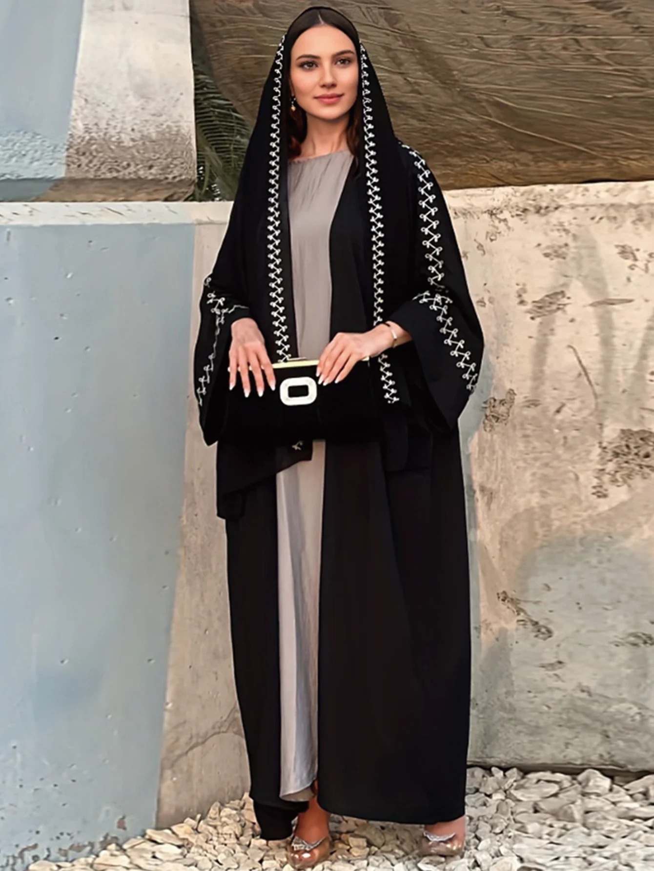 أطقم نسائية إسلامية أنيقة، عباية طويلة مع حجاب مطرز وتصميم كيمونو. تشمل قفطان وردهة متواضعة، مناسبة كملابس خارجية إسلامية للمناسبات والطلعات اليومية، تجمع بين الراحة والأناقة.
