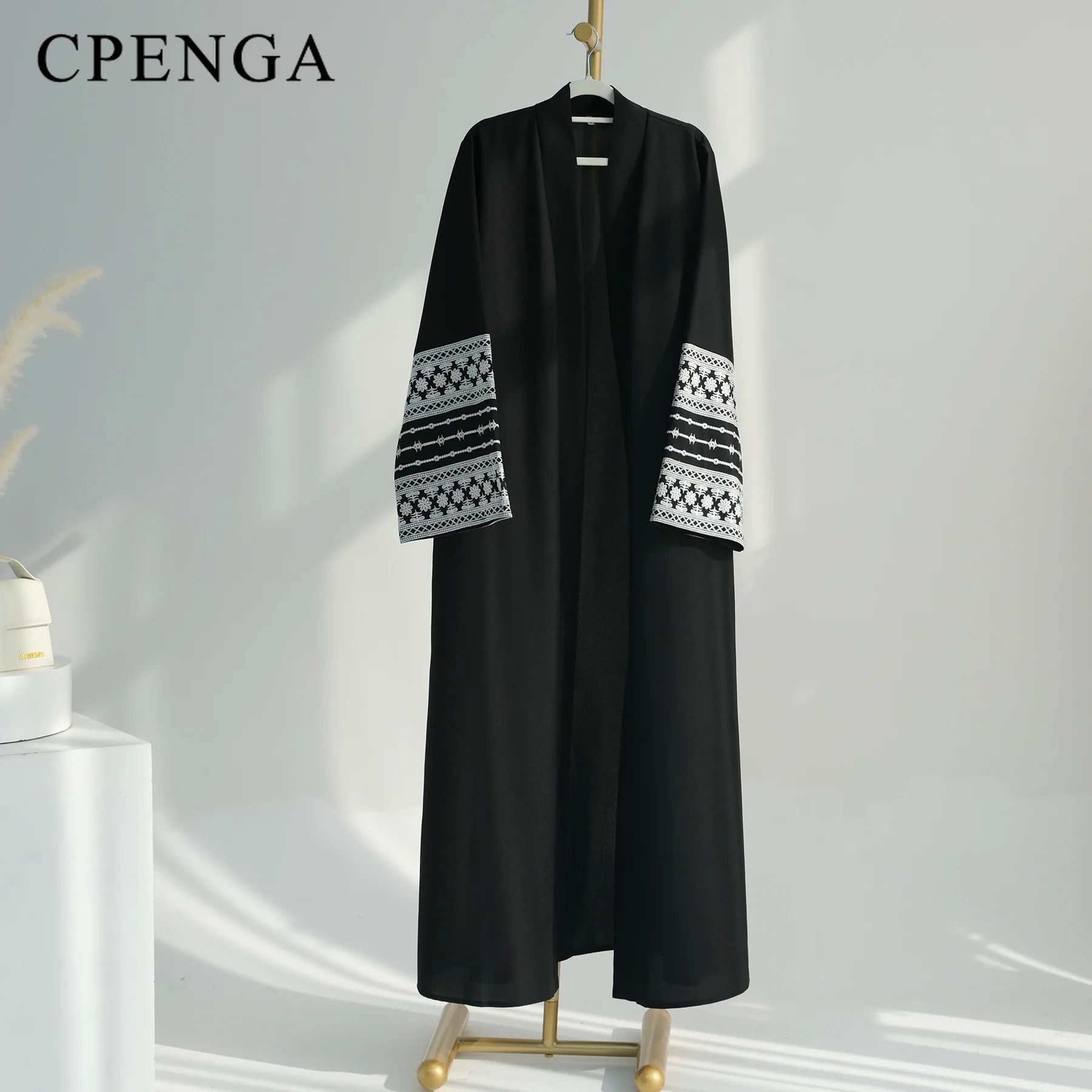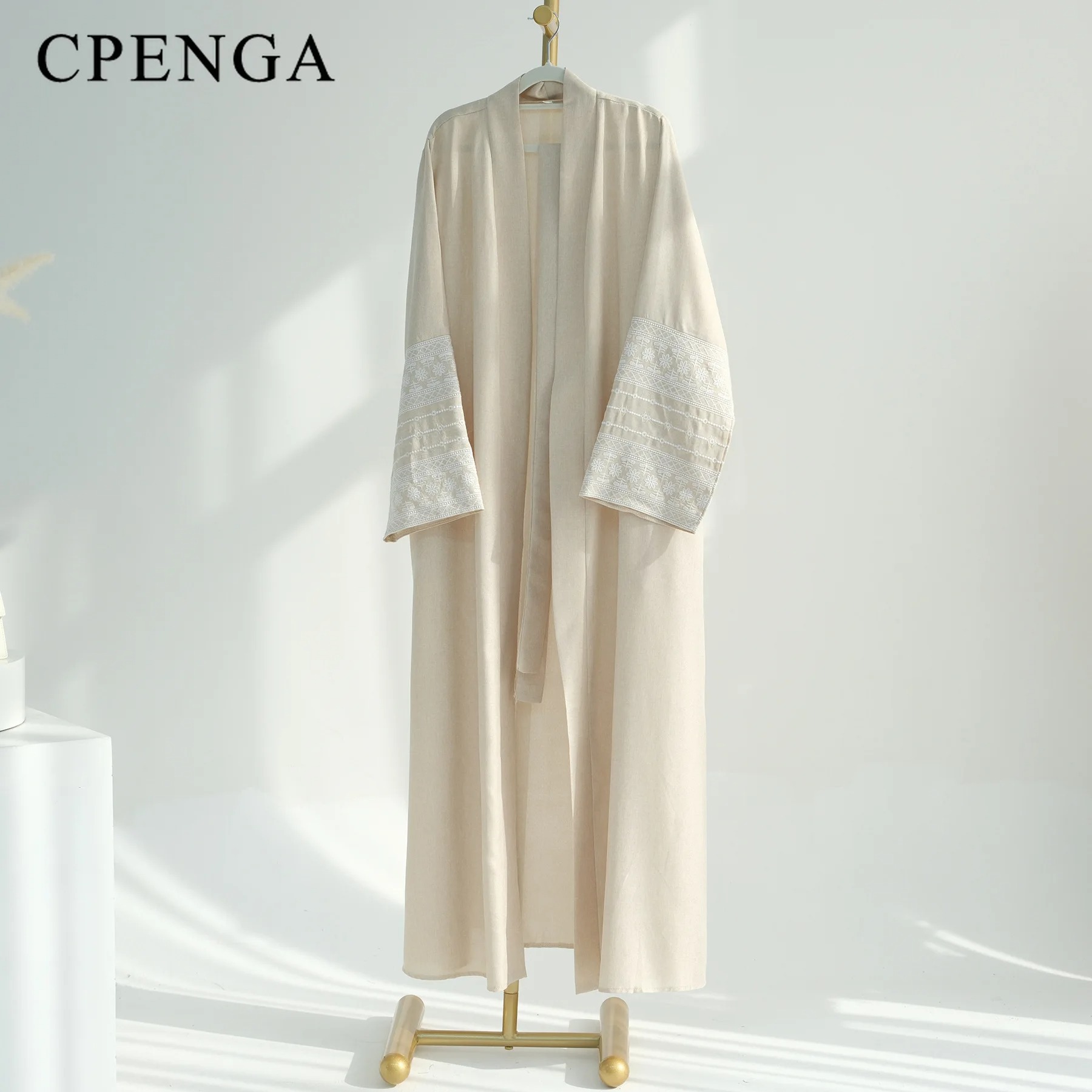 فستان إسلامي محتشم للنساء، مصنوع من القطن والكتان الخفيف، مثالي لشهر رمضان والعيد. عباية مفتوحة بتطريز أنيق، تصميم فضفاض بطول القفطان وأكمام طويلة، مستوحى من ستايل دبي وتركيا، يجمع بين الراحة والأناقة للطلعات والمناسبات الإسلامية