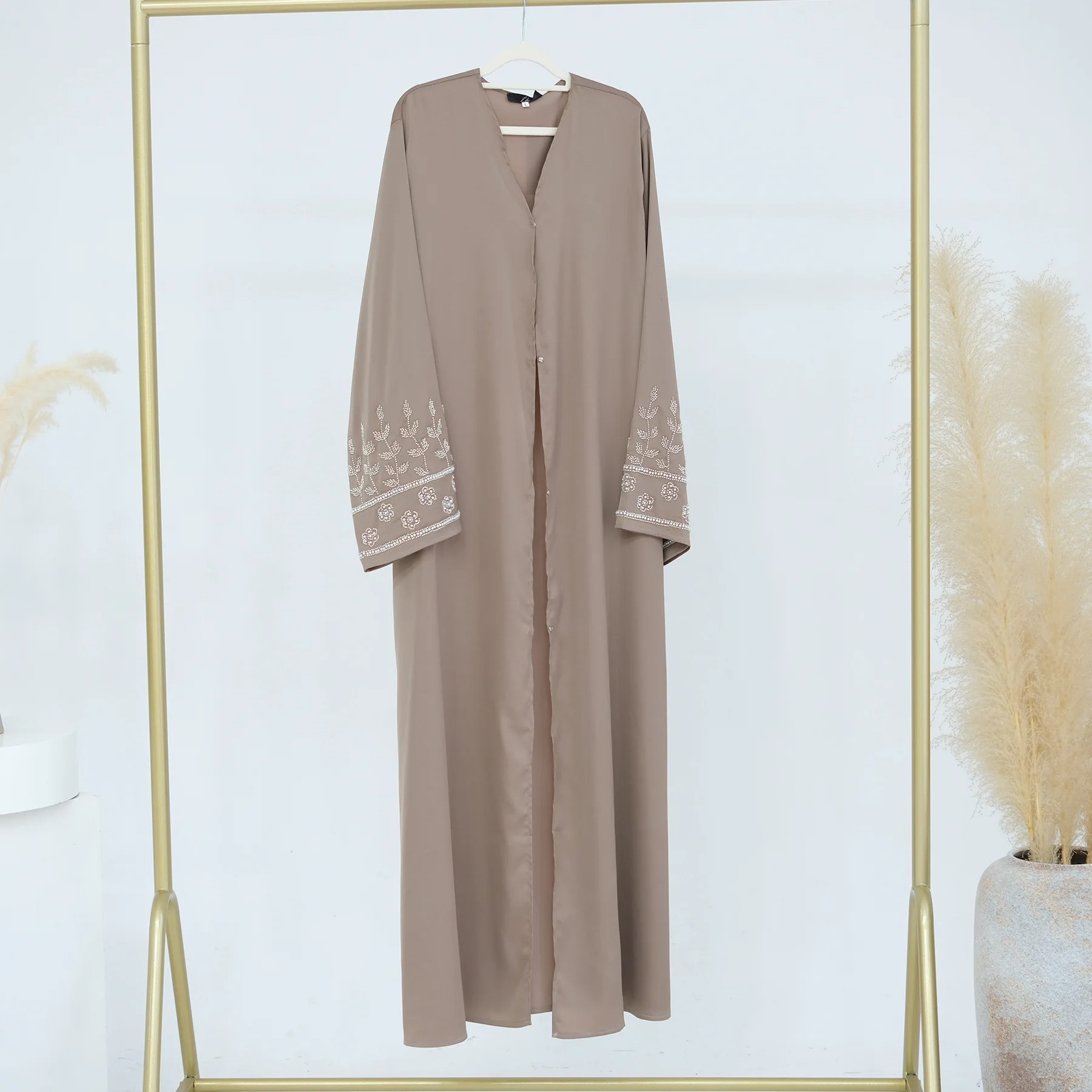 عباية فاخرة للنساء مزين باللؤلؤ، تصميم مستوحى من أزياء الشرق الأوسط لعام 2024. مناسب لرمضان والمناسبات، ويجمع بين ستايل دبي والجلابية التركية والكاftان المغربي. إطلالة راقية ومحتشمة تناسب الحفلات والطلعات الخاصة.