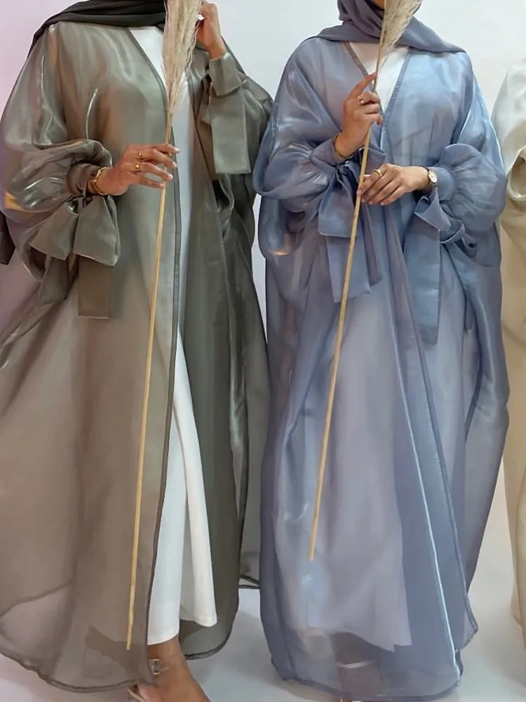 عباية صيفية ناعمة ولمّاعة، بقماش يجي كأنه حريري ويعطي إطلالة فخمة. أكمامها منفوشة وتضبط اللوك بشكل جميل، ومناسب لعيدك والطلعات. تصميم على ستايل دبي وتركيا، مريح وخفيف للصيف ويعطي أناقة رايقة للمسلمات