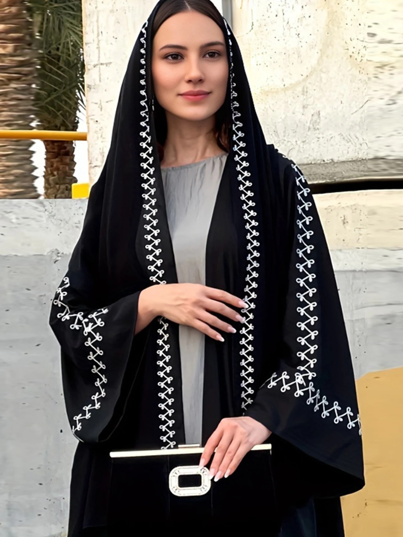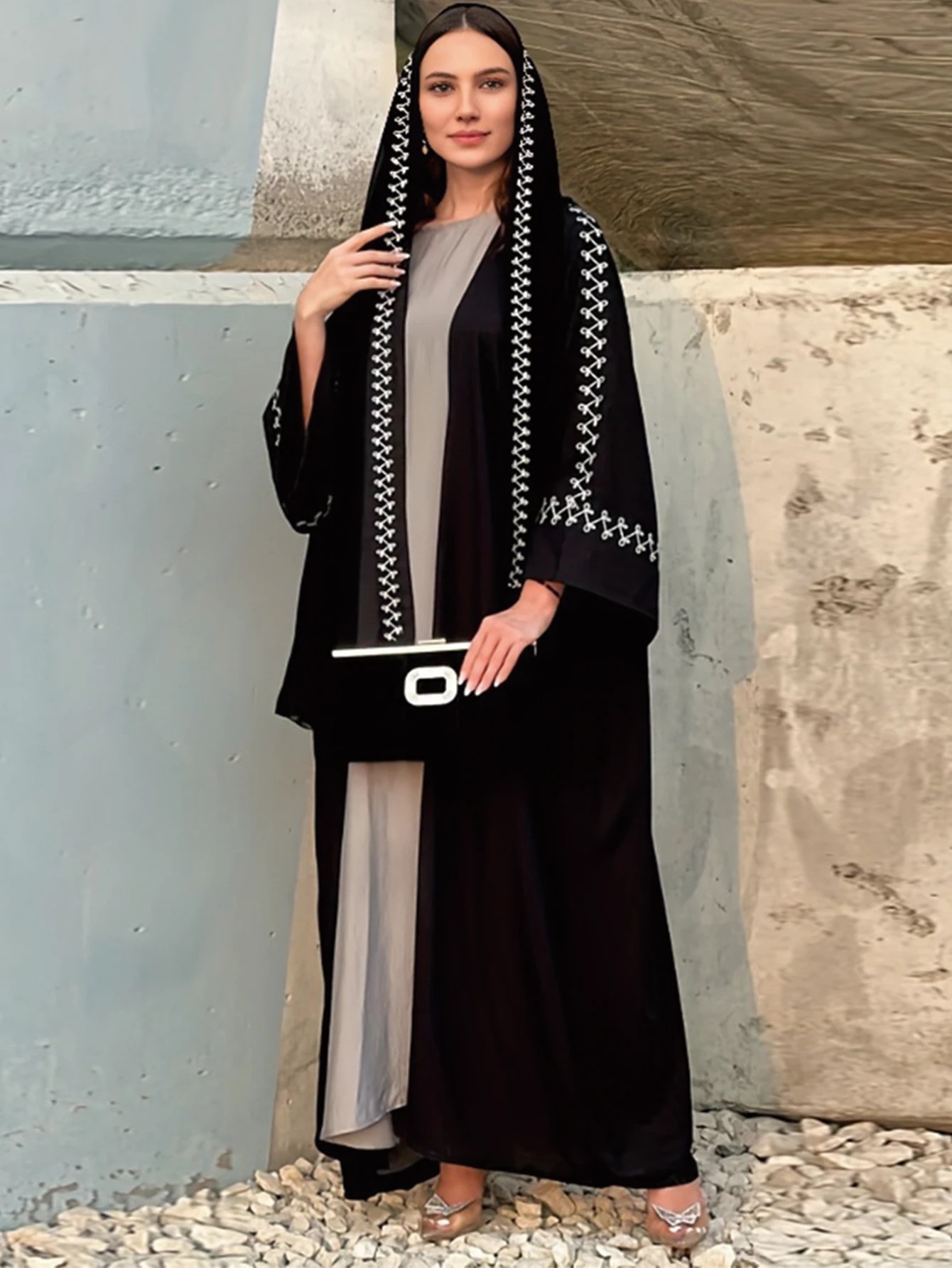 أطقم نسائية إسلامية أنيقة، عباية طويلة مع حجاب مطرز وتصميم كيمونو. تشمل قفطان وردهة متواضعة، مناسبة كملابس خارجية إسلامية للمناسبات والطلعات اليومية، تجمع بين الراحة والأناقة.