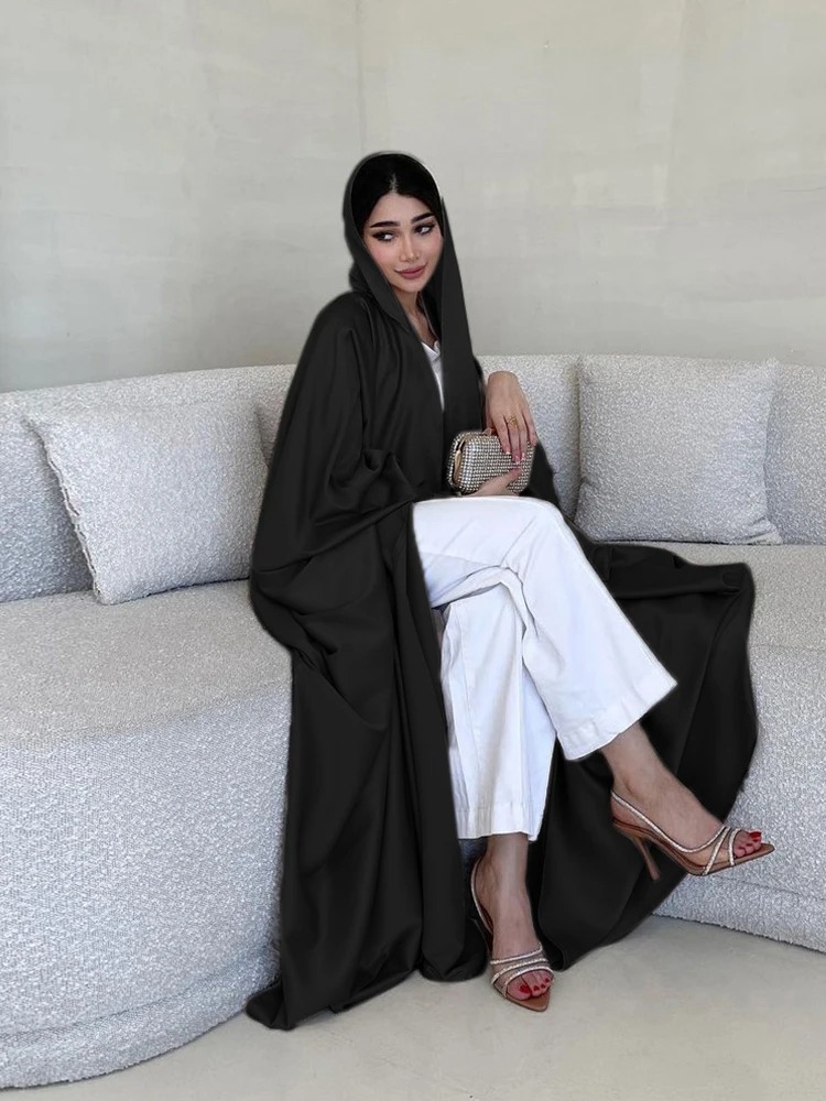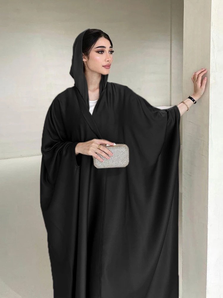 "عباية/ردية سوداء خفيفة وناعمة، تصميم عصرية بأكمام طويلة على شكل كم خفاش. مريحة وفضفاضة، مناسبة للملابس الإسلامية اليومية والطلعات غير الرسمية."